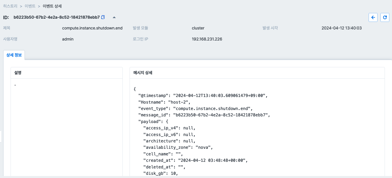 3. 이벤트 상세 화면이 출력됩니다. 다음은 인스턴스 삭제 이벤트에 대한 예시입니다.