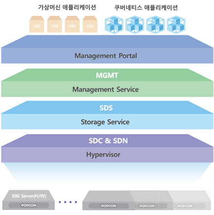 그림 하단의 POPCON 이미지는 물리적인 컴퓨팅, 스토리지, 네트워킹 장비를 의미합니다. 이러한 자원은 하이퍼바이저를 통해 가상화됩니다. 사용자는 각 자원을 별도로 관리할 필요 없이 단일 관리 콘솔을 통해 가상 머신을 생성하거나 컨테이너 환경을 구축하여 애플리케이션을 배포할 수 있습니다.