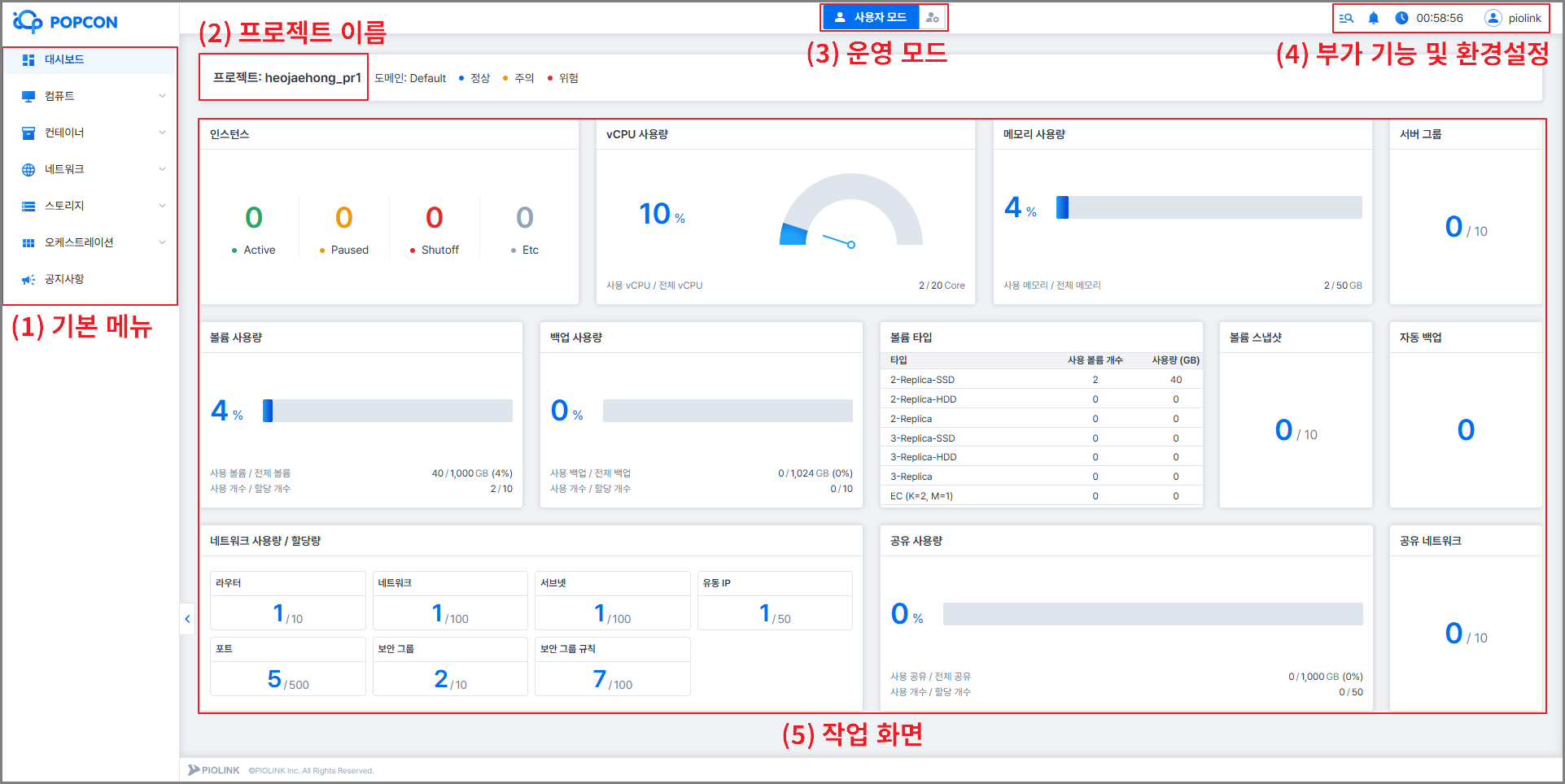 POPCON HCI를 사용하거나 관리하기 위한 모드를 선택합니다. 사용자 모드는 주로 인스턴스 운영을 위한 모드이고, 관리자 모드는 POPCON HCI를 구성하는 인프라와 사용자를 관리하기 위한 모드입니다. 관리자 모드는 관리자 계정만 접근할 수 있습니다.