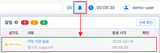 • 알림: 최근 24시간 동안 POPCON HCI에서 발생한 알림 목록. 알림 규칙은 관리자 모드 > 히스토리 > 알림 규칙 설정에서 설정 가능.