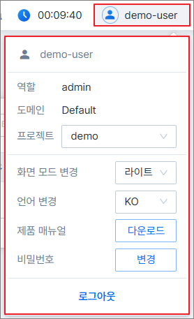 • 프로젝트: 현재 선택된 프로젝트 이름. 사용자가 여러 프로젝트에 속해 있는 경우, 프로젝트 선택 가능.