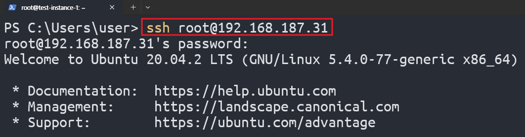 아래 이미지는 유동 IP가 192.168.187.31인 리눅스 인스턴스에 SSH를 통해 접속하는 예입니다.