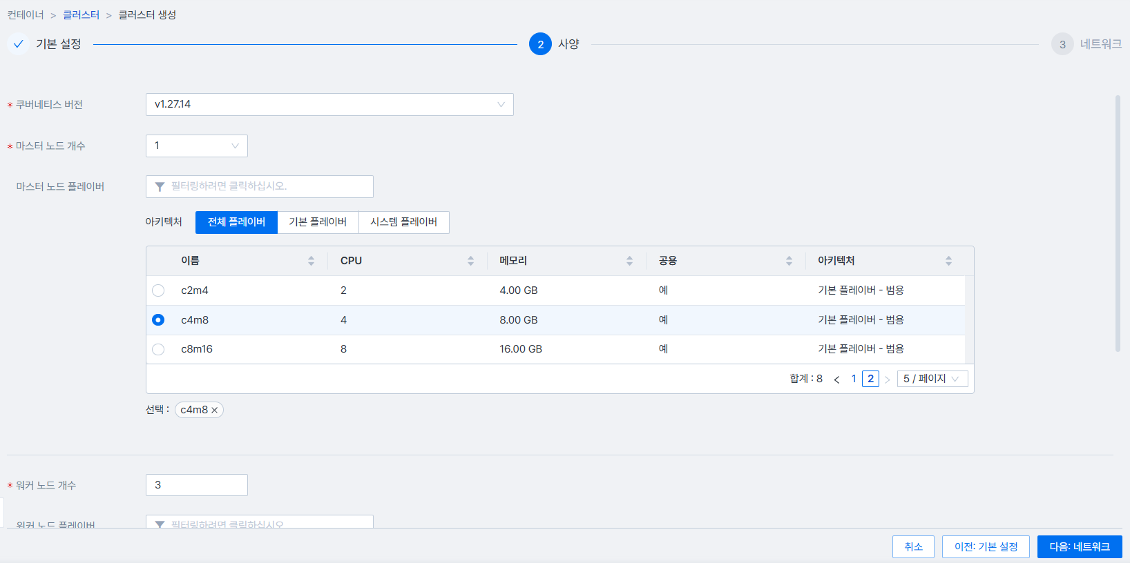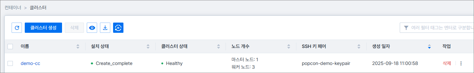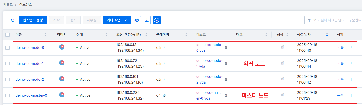 클러스터 생성이 완료되면 컴퓨트 > 인스턴스 메뉴에서 마스터 노드와 워커 노드를 확인할 수 있습니다.