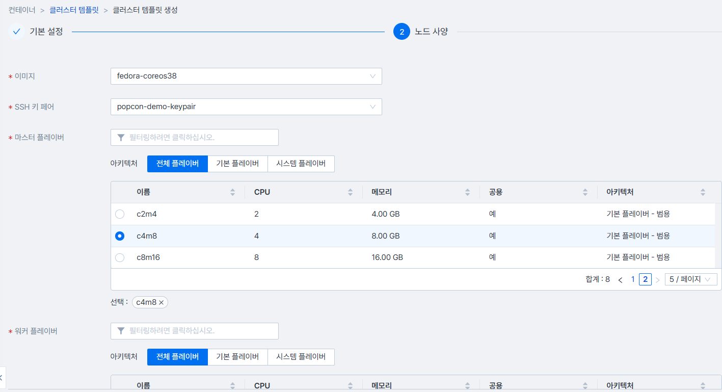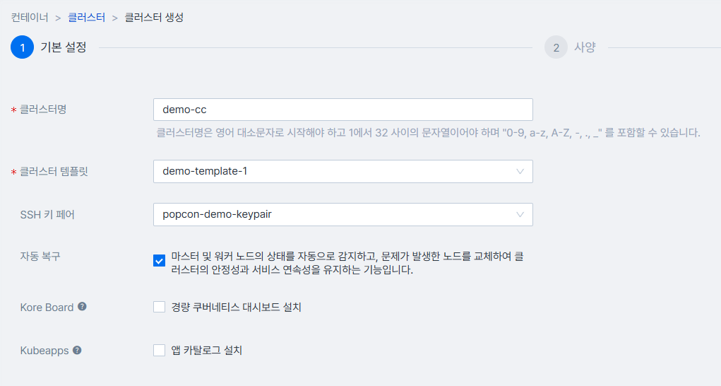 다음: 노드 사양을 클릭합니다.- 클러스터 템플릿 이름: demo-template-1