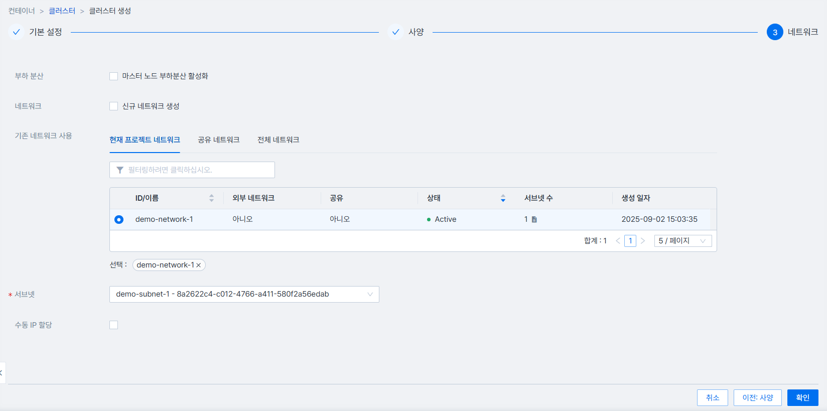 - 기존 네트워크 사용: 현재 프로젝트 네트워크 > demo-network-1