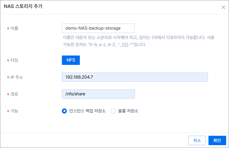 <NAS 스토리지 추가> 창이 출력됩니다. 설정 예시는 다음과 같습니다.