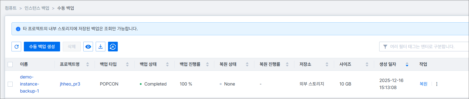 컴퓨트 > 인스턴스 백업 > 수동 백업 메뉴를 클릭합니다.