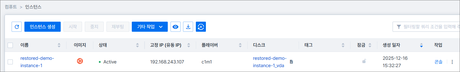 복원 상태 컬럼이 InProgress로 변경되고 복원이 진행됩니다. 복원이 완료되면 [컴퓨트 > 인스턴스] 메뉴에서 복원된 인스턴스를 확인할 수 있습니다.